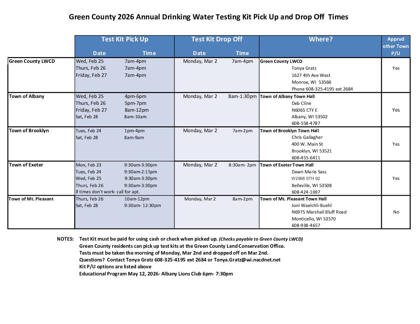 Sample kits are available for pick up the last week of February at specified times and locations. This year we are focusing on the NE townships of the county (Exeter, Brooklyn, Mt.Pleasant, and Albany). But it’s open to anyone wanting to test in the county. There will be kits available at the LWCD office as well. Samples will be taken Monday, March 2nd and returned to the pick up location. A follow up meeting will be held May 12 at 6pm at the Albany Lions Club.